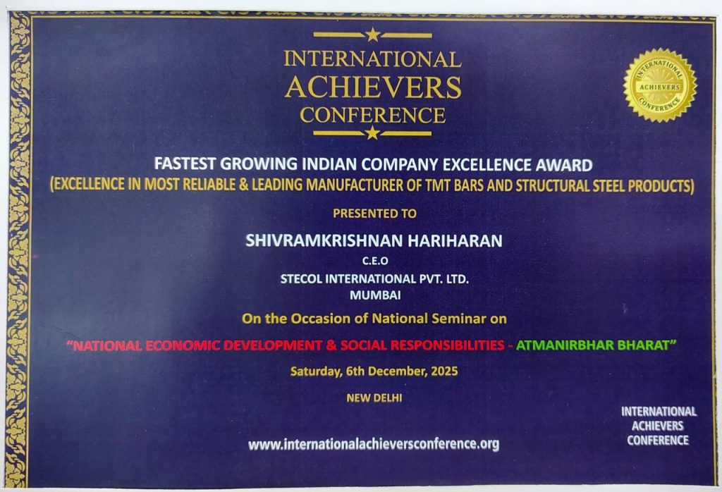 Stecol’s product, Essar TMT, was recognised for *“Excellence in Most Reliable & Leading Manufacturer of TMT Bars and Structural Steel Products.”*